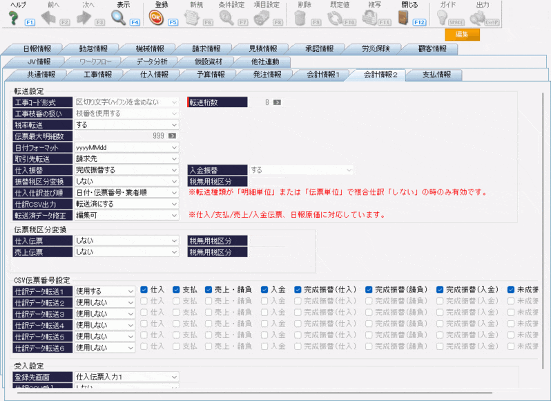 【※1】 「転送桁数」に関して 奉行シリーズの場合、転送時の工事コードの桁数を設定します。 工事コードの属性が文字の場合、一度マスタ連動した後に転送桁数を小さくすることはできません。 小さくした場合、転送、受入でうまく行かない場合がありますのでご注意ください。