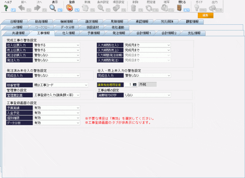 [工事登録]-『予算実績』の表示・非表示を設定します。 「有効」「無効」から選択します。 不要な場合は「無効」を選択してください。 タブ自体の表示がされなくなります。 |