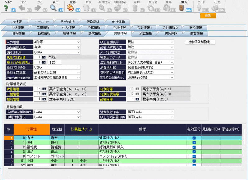 【※5】 行属性パターンに関して ①「小計」 「51.小計」「52.中計」「53.大計」のみで使用可能です。 ②「労務費」* [見積入力]-『明細』で労務費計算したい明細を選択し、選択した品名の[品名一覧登録]-『品名』で設定した 労務費歩掛係数の合計を『見積情報』で設定した見積単価と原価単価にかけ、単価を算出します。 ③「消耗品費」* [見積入力]-『明細』で消耗品費計算したい明細を選択し、選択した品名金額に[品名一覧登録]-『品名』で設定した 各品名の消耗費掛率をかけて掛金額を算出し、掛金額の合計を見積単価として見積金額を計算します。 ④「計算」 階層単位に、挿入した行までの合計金額に『見積情報』の見積掛率(%)と原価掛率(%)を掛けて計算します。 ⑤「法定福利費(労務費率)」 左記の行属性を挿入した行までの合計金額に『見積情報』の見積掛率(%)、 原価掛率(%)を掛けて 労務費☆1を算出します。 上記☆1で算出した労務費に『見積情報』の保険料設定に設定した保険料率(%)と加入率(%)をかけて 法定福利費を計算します。 ⑥「法定福利費(労務費総額)」 [見積入力]-『明細』で入力した品名の要素内訳の設定をもとに労務費を計上します。 この場合、 [要素内訳一覧登録]-『原価要素内訳』で定福利費集計を「する」に設定します。 [見積入力]-『明細』に入力した明細のうち、要素内訳の法定福利費集計が「する」になっている明細を集計し、 労務費☆2を算出します。 上記☆2で算出した労務費に『見積情報』の保険料設定に設定した 保険料率(%)と加入率(%)をかけて法定福利費を計算します。 * ②労務費と③消耗品費の詳細に関しましては、[行属性 労務費/消耗品費計算]をご参考ください。