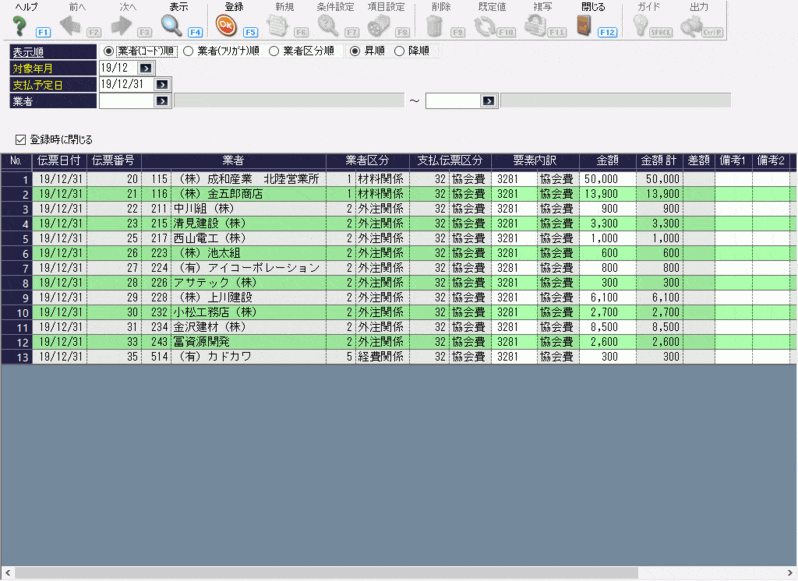 表示順を選択します。 「業者(コード)順」「業者(フリガナ)順」「業者区分順」から 選択します。 |