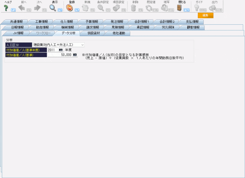 共通情報工事情報仕入情報予算情報発注情報会計情報1会計情報2支払情報日報情報勤怠情報機械情報請求情報見積情報承認情報労災保険顧客情報JV情報データ分析仮設資材他社連動