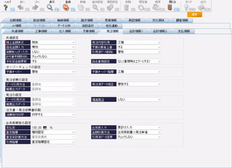 共通情報工事情報仕入情報予算情報発注情報会計情報1会計情報2支払情報日報情報勤怠情報機械情報請求情報見積情報承認情報労災保険顧客情報JV情報データ分析仮設資材他社連動